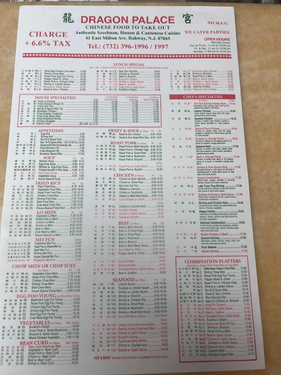 Dragon Palace offers a variety of traditional and flavorful Chinese dishes, catering to a wide range of tastes. For appetizers, you can start with the crispy Egg Rolls or the light and fresh Spring Roll. Their chicken selection includes the savory Chicken with Black Bean Sauce and the rich Chicken with Mushroom, both offering distinct, satisfying flavors. If you're in the mood for soup, the comforting Wonton Soup or the hearty Wonton Egg Drop Soup Mixed are excellent choices. For fried rice lovers, the Vegetable Fried Rice and Roast Pork Fried Rice are classic options, each bursting with flavor. The chow mein offerings, such as Chicken Chow Mein and Shrimp Chow Mein, feature tender noodles paired with well-seasoned meats and vegetables. Whether you're craving something light or a more filling dish, Dragon Palace's menu promises a delicious experience for all.